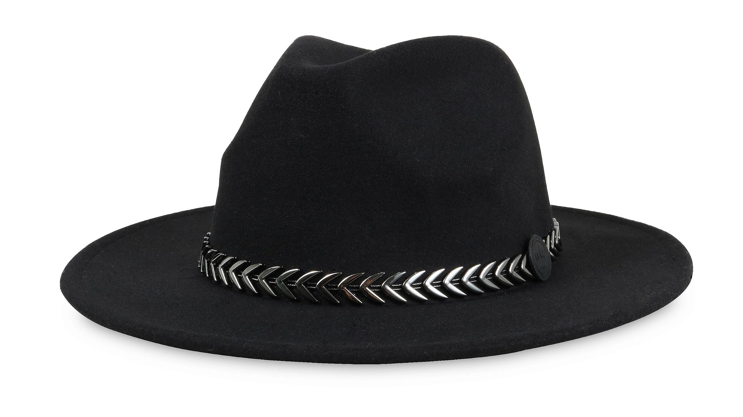 Chapéu Fedora edição especial customizado com corrente metalizada em forma de setas metalizadas na cor Chumbo. Modelo super estiloso e moderno, que faz a cabeça dos amantes de acessórios exclusivos e luxuosos. Este chapéu possui aba reta estruturada de 7 centímetros e ajuste interno de tamanho para vestir confortávelmente à todos os tamanhos. Garanta já o seu e descubra como este chapéu pode renovar e dar o brilho final ao seu Look!