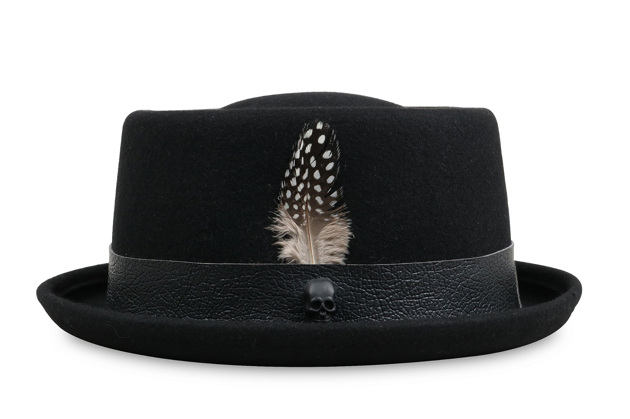 O chapéu Pork Pie já é por si só um acessório de moda estiloso e famoso mundialmente. Agora, com esta customização incrível criada exclusivamente pela Chapéu Premium, você vai descobrir com dar mais versátilidade e enriquecer muito mais o seu look. Modelo de chapéu customizado com uma faixa de couro preto, caveira preto fosco e uma pena, o que o deixa extremamente estiloso e moderno. Compre o seu agora pois esta edição é limitada.